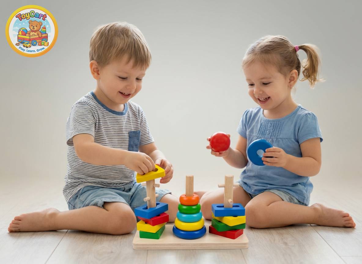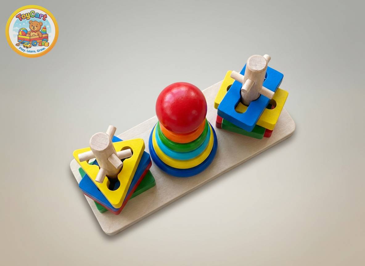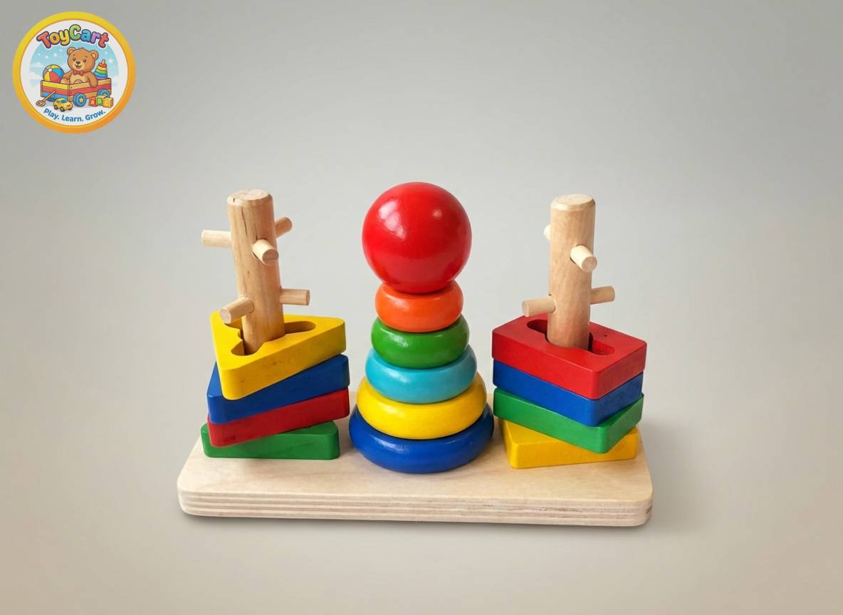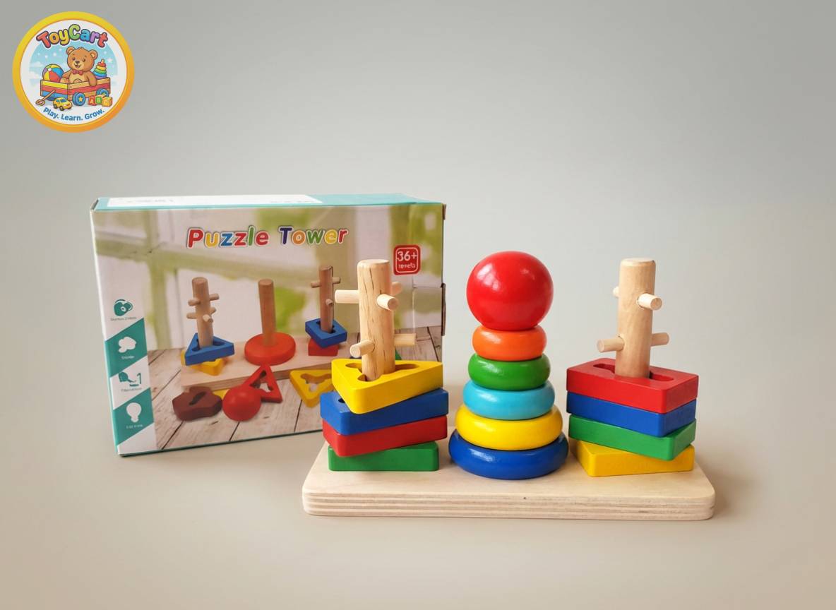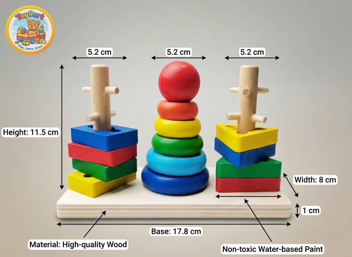 This multi‑column wooden stacking tower comes with a variety of shapes and colours for children to sort, stack and match. The chunky pieces are easy to grasp and encourage fine‑motor development, hand‑eye coordination and logical thinking as kids arrange rings and blocks by size or shape[2]. Bright colours help with colour recognition, while the natural wooden material adds durability and a classic aesthetic. Recommended for ages 2½ and up, it’s a timeless educational toy for early learners.